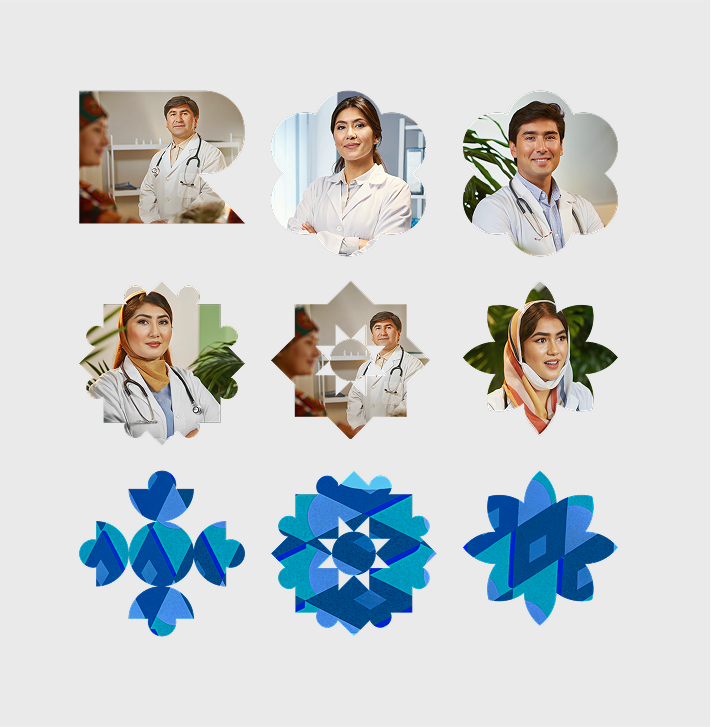 Мы превратили традиционные мотивы керамики, сузане и адраса в модульный паттерн: одни и те же геометрические ячейки живут в бэкграунде сайта, превращаются в вырубки-маски для фотографий врачей и пациентов, а также работают как независимые иллюстрации-пиктограммы на баннерах и в соцсетях.