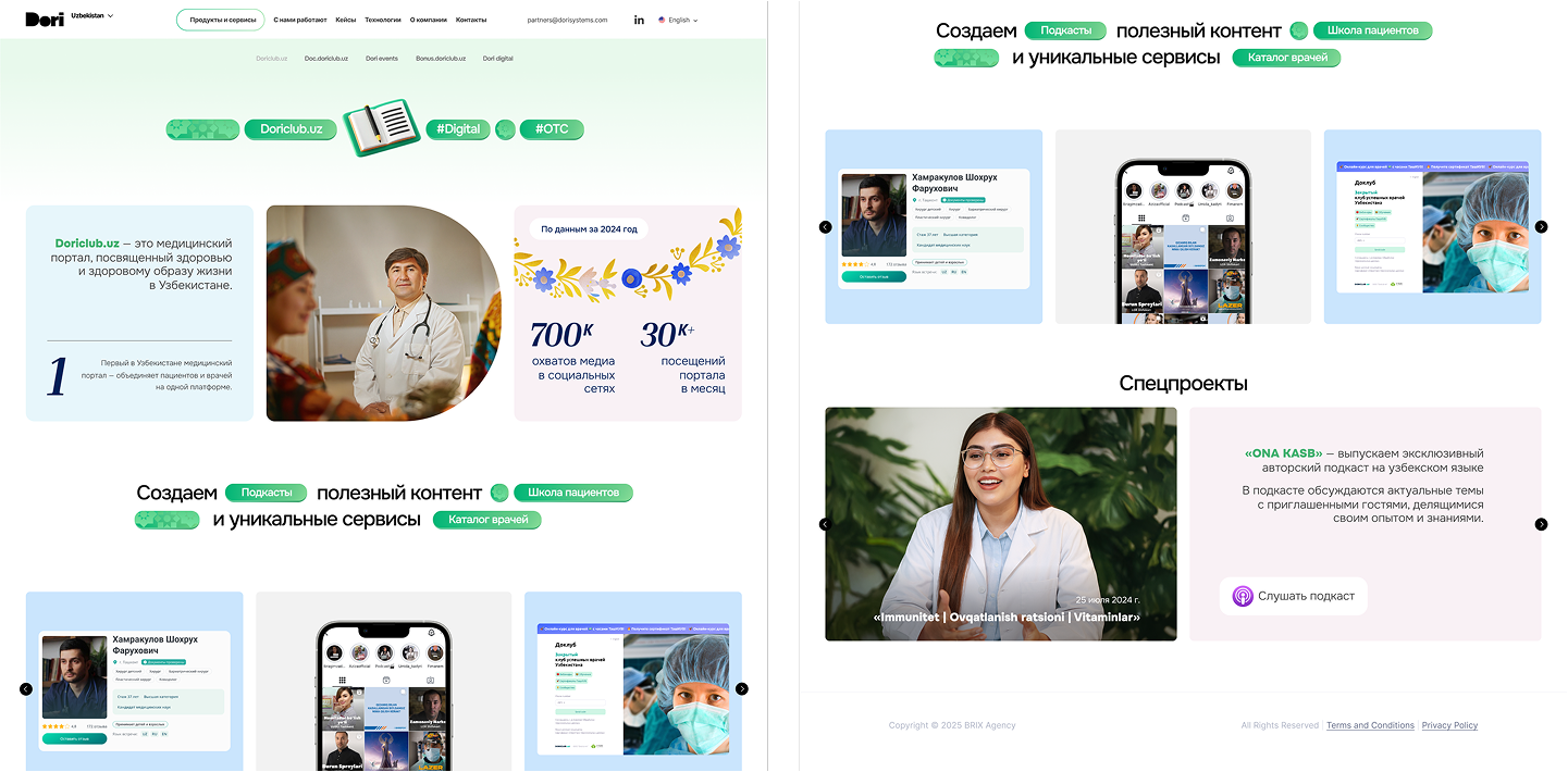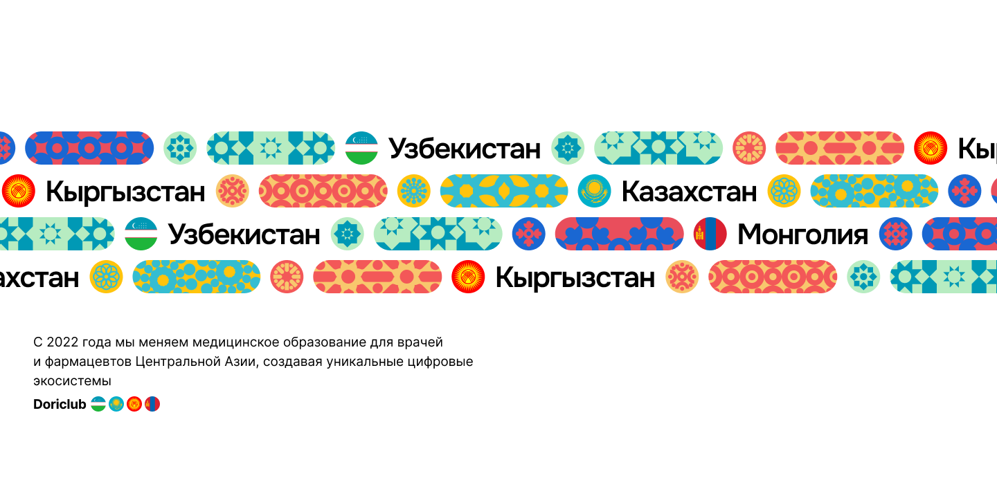 DORI — это цифровая экосистема, которая с 2022 года реформирует медицинское образование для врачей и фармацевтов Центральной Азии. Мы создали для неё адаптивный сайт и универсальный визуальный язык: яркий региональный колорит с европейской лаконичностью